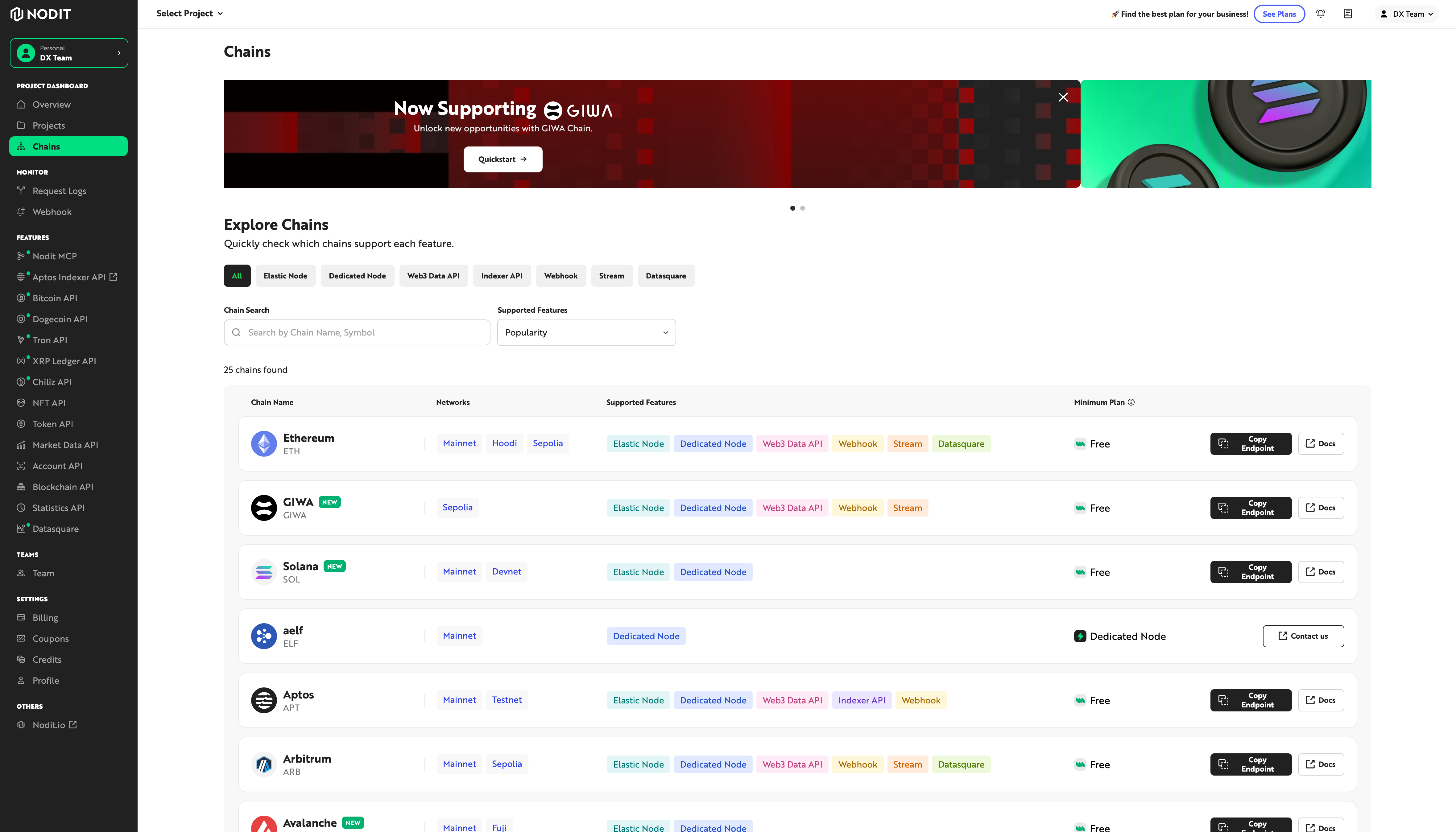 이를 통해 각 Chain이 지원하는 Elastic Node, Dedicated Node, Web3 Data API, Webhook, Stream, Datasquare 등을 한눈에 확인할 수 있습니다.
