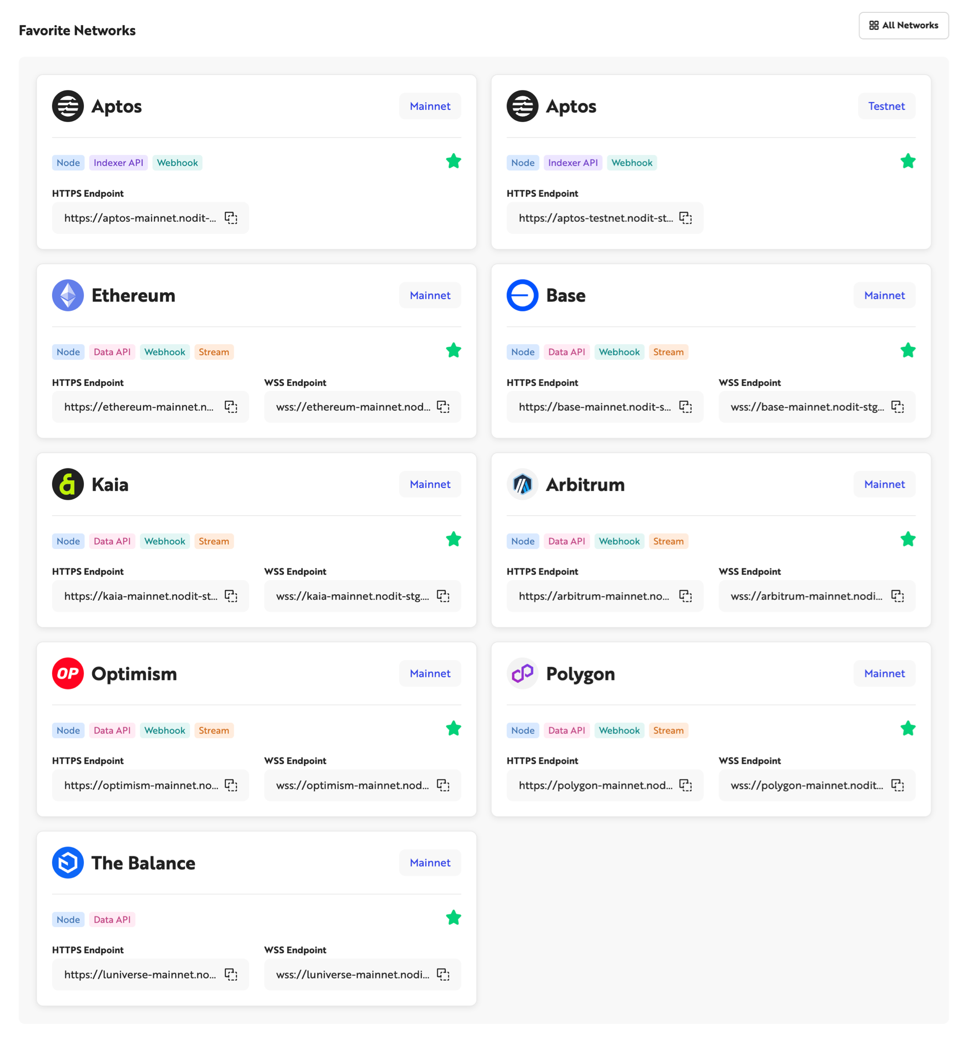 This area displays the networks you have added to your favorites from the full list of networks supported by Elastic Node. You can click the Networks menu on the left, the [All Networks] button in the upper right of the area, or the [Go To Networks] button displayed in the area upon first access to view the full network list and add your preferred networks to favorites.